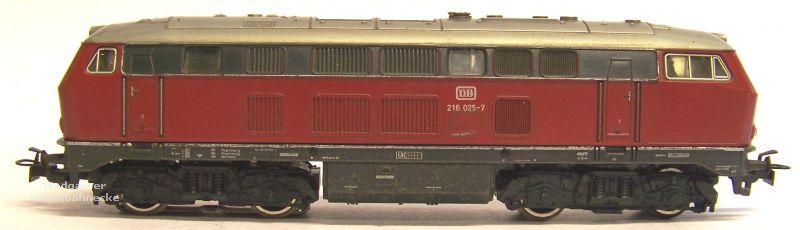 | 3672 | Diesel-Hydraulische-Rangier-Lok | Diesellok 212 * oder Modell der Baureihe V100 der Deutschen Bundesbahn * 4-Achsig * Achsfolge B'B' * 2 Achsen angetrieben * 4 Haftreifen * Fernsteuerung für Vor- und Rückwärtsfahrt * Beleuchtetes Dreilicht-Spitzensignal * Kunststoffgehäuse * Maßstäblich schmale Vorbauten An beiden Enden Relex-Kupplung * Länge über Puffer 14,1 cm * wie 3072 mit Digitaldecoder | 1985 | ||