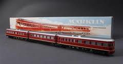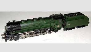 Lokomotive mit Schlepptender * Modell der Baureihe 23 der Deutschen Bundesbahn * 5-Achsig * Achsfolge 1'C1' * Fernsteuerung für Vor- und Rückwärts-fahrt * Zusätzlicher Handschalthebel * Heusinger Steuerung * beide Laufgestelle werden durch Federn an das Gleis gedrückt dadurch keine Entgleisungsgefahr und gute Kurvengängigkeit * Kupplungshaken am Laufgestell angebracht, ergibt auch vorne vollwertige Kupplungsmöglichkeit * 2 Plastkreifen auf den Rädern der hinteren Treibachse zur Erhöhung der Zugkraft * Hoch untersetzes Getriebe * 2 elektrsche Stirnlampen * Mattschwarzes, stabiles Ganzmetallgehäuse mit maßstäblich genauer Nachbildung der Kesselarmaturen des großen Vorbildes und geschlossenem Führerhaus * Gegossenes Metallfahrgestell * Tender eng an die Lokomotive gekuppelt * Wiedergabe des geschweißten Vorbildes * 2 Drehgestelle * Automatische Kupplung und viele Einzelheiten * Länge über Puffer 24,5 cm * Gewicht 550 g | Die Lokomotiven der Baureihe 23 der Deutschen Bundesbahn werden im mittleren und schweren Personenzugdienst, für Eil- und leichte Schnell- und Güterzüge verwendet. Die Lokomotiven und Tender wurden im neuzeitlichen Schweißverfahren hergestellt und haben durch ihre günstige Konstruktion eine Geschwindigkeit von 110 km/h vorwärts und 85km/h rückwärts. Da bei dieser Type im Großbetrieb eine hohe Rückwärtsgeschwindigkeit zugelassen ist, wird sie auch häufig im Schweren Vorort- und Zwischenstätdischemverkehr an Stelle der Tenderlokomotiven verwendet. | 1961 / 39,00 |