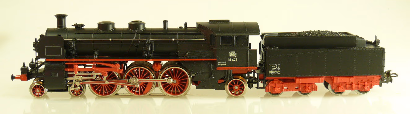 Die rauchende Schnellzug-Lokomotive BR 18 mit Schlepptender * Modell der Baureihe 18 der Deutschen Bundesbahn ( bayer. S3/6 Bauserie i) mit der Achsfolge 2'C1' * 3 Achsen angetrieben * 2 Haftreifen * Nachbildung der Heusinger-Steuerung * Fernsteuerung für Vor- und Rückwärtsfahrt * Einrichtung zur wirklichkeitsnahen Raucherzeugung, bestehend aus dem in der Lok eingebauten Raucheinsatz und einer Ampulle Dampföl, dazu Kanüle zum Einfüllen des Dampföls * Beleuchtetes Dreilicht-Spitzensignal * Mattschwarzes Metallgehäuse * Sehr feine Detailierung der Armaturen * Fahrgestell aus Zinkdruckguß * Am Tender automatische Kupplung mit Vorentkupplung (Relex) * Länge über Puffer 24,9 cm | 1972 / 89,00 | |